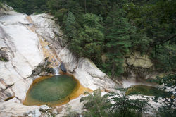 Waterfalls form ponds (baths) on the rock. The name indicates 12 such places, but there are only eight ponds. The one on the highest spot named Boksungatang Basin is by far the best in the 84m-long valley.